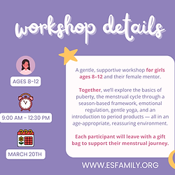 First Moon Becoming You: Understanding puberty, periods and feelings - Together This gentle, supportive workshop is designed for girls ages 8–12 and their female mentor (mother, grandmother, aunt etc.). Mentors are encouraged & welcome to join the class with their child/youth or relax in the lounge during the session; however, mentors must remain on site at all times. In a comfortable, age-appropriate setting, we will explore the basics of anatomy and physiology, including the menstrual cycle and how it can be understood through the rhythm of the four week cycle and the seasons. Participants will build body awareness and learn about the physical changes of puberty in a way that is clear, respectful, and reassuring. We will also gently explore the emotional side of growing up, introducing simple tools for emotional regulation and self-care. The workshop includes gentle yoga practices suited to different phases of the cycle, as well as hands-on exploration of period products so participants can become familiar with their options in a relaxed, supportive environment. Our goal is to help girls feel informed, confident, and supported as they begin to understand their changing bodies — knowing that these changes are natural, normal, and something they don’t have to navigate alone. Each youth will leave with a gift bag to support their menstrual journey, as well as the offer of a discounted service by Maria to be used at a later date.